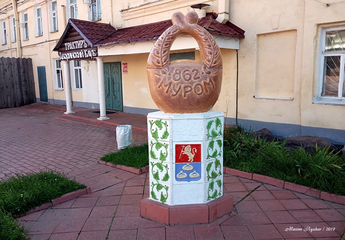 На гербе города Мурома нарисовано три калача, что отражает известное местное занятие - выпечку всяких вкусняшек. Наверное, каждому известны выражения - "муромский калач" и "тульский пряник". Но, до Тулы я еще не добрался, поэтому не знаю какие у них там пряники. А вот выпечка и хлеб в кафешках, в Муроме очень вкусные, тут не придерешься. По местной легенде, в 1781 г. через город, по каким-то своим делам, проезжала Екатерина II и ей так понравились местные калачи, что она повелела поместить их на герб города. Памятник этой достопримечательности установлен почти в центре, недалеко от площади 1100-летия. Самое интересное, что этот памятник теплый (!). Пишут, что у него поддерживается постоянная температура, около 35 градусов, чтобы он не треснул от мороза. По информации из интернета, в планах установить в калач распылители, после чего скульптура будет пахнуть свежеиспеченным хлебом.