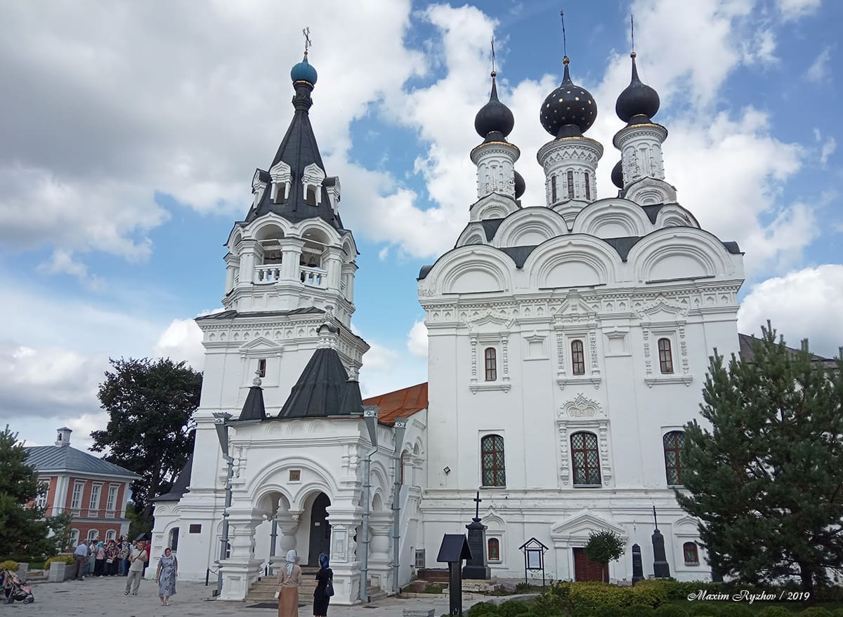 Буквально в паре шагов от него, располагается Троицкий женский монастырь, построенный в 1642 г. Известен тем, что в нём находятся мощи святых Петра и Февронии, которые почитаются в России как покровители семьи и брака. Кстати, если кто не в курсе, то в Муроме ежегодно проводится праздник «