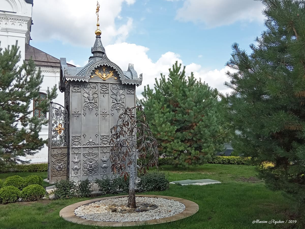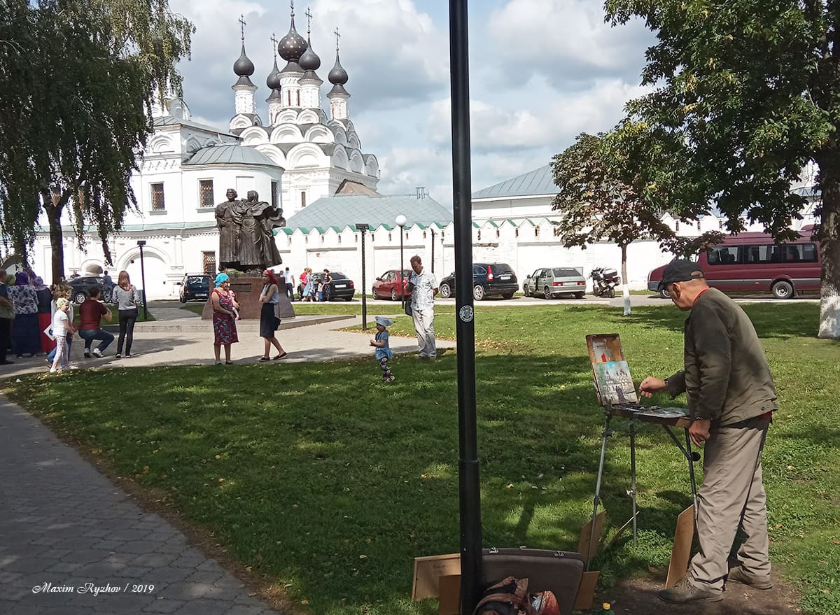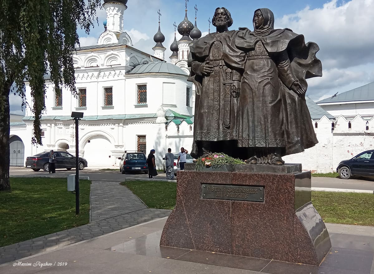 Недалеко от стен стен Троицкого женского монастыря, находится памятник святым Петру и Февронии (в самом монастыре хранятся их мощи). Все же слышали эту удивительную историю, которая достойна пера Стивена Кинга? В путеводители по городу, о этой паре написано всего несколько строк. Как я понял, основная их заслуга (за что их почитают), в том, что "... они дали друг другу обещание умереть в один день и час и быть похороненными вместе, в едином гробе, который изготовили себе еще при жизни". Причем здесь Кинг спросите вы? Ну, например, вот поэтому "... Супруги даже приготовили двухместный гроб, в котором их тела разделяла бы лишь тонкая перегородка. Предание гласит, что мольбы их были услышаны и они преставились в один и тот же час — 25 июня 1228 года по старому стилю (8 июля по действующему календарю). Но воля усопших не была исполнена, супругов похоронили по отдельности. Но, два раза случалось необъяснимое, и тела невероятным образом оказывались вместе. После этого священнослужители захоронили Петра и Февронию вместе возле церкви Рождества Пресвятой Богородицы" (цитата с культура. рф)