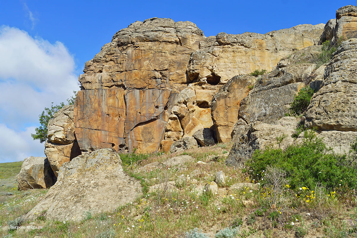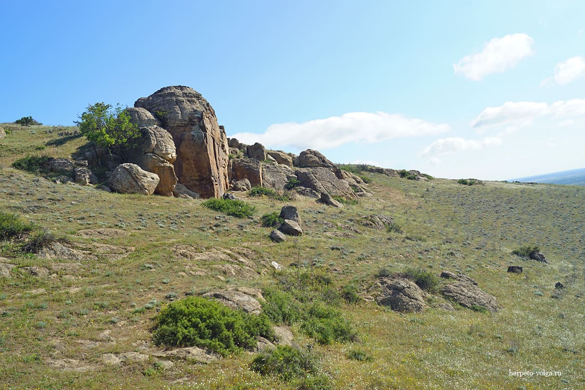 А на следующий день, когда мы уже основательно полазили по горам, заметили относительно небольшую гряду камней (на фото ниже), которая выглядела очень перспективно с точки зрения животных. Но, подойдя поближе мы увидели рисунки на камнях, что было гораздо интереснее, чем живность. Так как змей можно было и потом поймать, тем более, что все еще было впереди и поездка по Дагестану только началась. А вот прикоснуться к подобным вещам вряд ли где-то еще получится. Ну и кроме того, не знаю как другие читатели моего блога, но я такие рисунки вижу в первый раз, хотя меня довольно сложно назвать домоседом.
