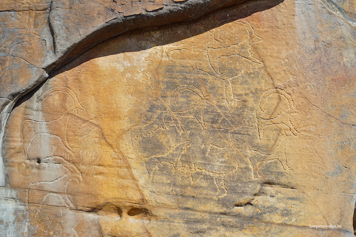 Давайте для начала разберемся, что такое петроглифы. Так называются выбитые или нанесённые краской изображения на камнях. Собственно, мы как раз и нашли выбитые на скале рисунки различных животных. От наскальной живописи (пещерной) отличаются тем, что петроглифы, как правило, находятся на открытой местности. К сожалению, кроме древних дагестанцев, свои письмена оставили и их современные, не очень умные, потомки. По различной информации из интернета удалось узнать, что рисунки на скалах из Дагестана, датируются начиная от эпохи ранней бронзы (примерно с 3500 по 2500 лет до нашей эры) и до позднесредневекового времени. Вообще, Дагестан, является рекордсменом на Кавказе по первобытной наскальным рисункам. По количеству, качеству и разнообразию древних шедевров Дагестан не имеет себе равных. Тут найдено 26 стоянок первобытных художников — в общей сложности более 7000 рисунков. Более того, есть информация, что некоторые рисунки на скалах, были найдены только в конце 2010-х гг.