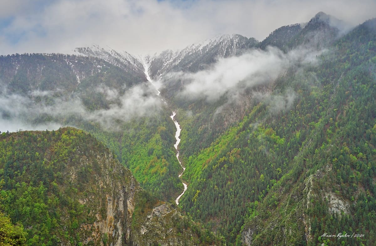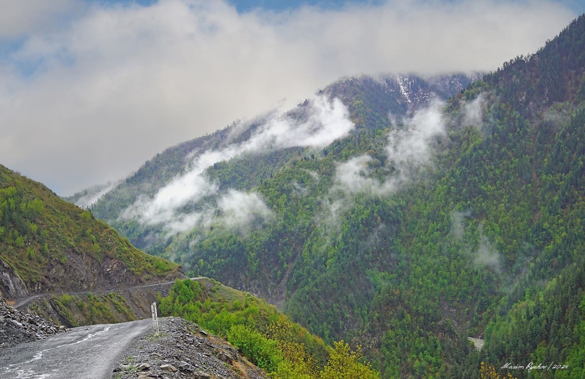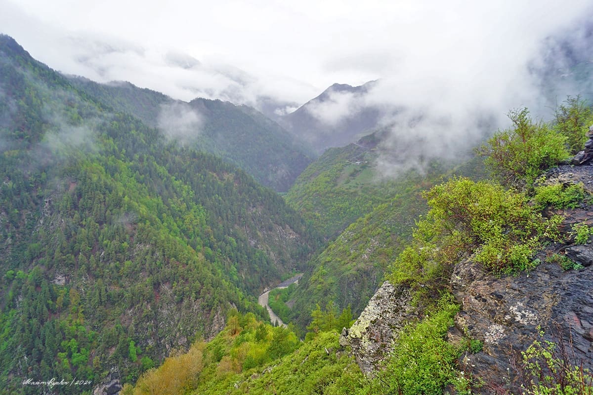После Тляраты хорошая дорога заканчивается и становится узкой, как и положено всем грунтовкам. Но, тут своя специфика - с одной стороны гора, с другой - ущелье. Естественно, при таких условиях особо не погоняешь и приходится ехать максимум 40 - 50 км/ч. Особенно интересно, когда идет встречка и не понимаешь, что лучше - прижаться к горе или как-то освободить дорогу, так что-бы не свалиться вниз. Если с отсутствием желания соскользнуть вниз - все понятно, то вариант прижаться к горе опасен тем, что шел жуткий ливень и из-за этого с гор скатывались камешки, иногда вполне солидные по размеру. Плюс к этому всему, мы находились на высоте около 2000 м над уровнем моря и голова прилично так гудела (постоянный шум в ушах, видимо с непривычки). Ехать там реально очень страшно. Во всяком случае для меня, жителя равнины, эту дорогу можно назвать более чем экстремальной. Но, все это компенсировалось шикарными видами за окнами машины.