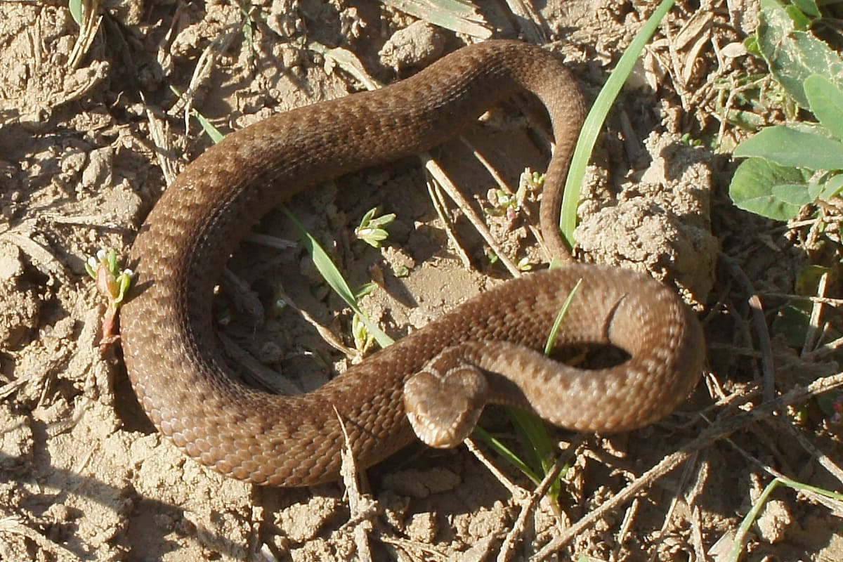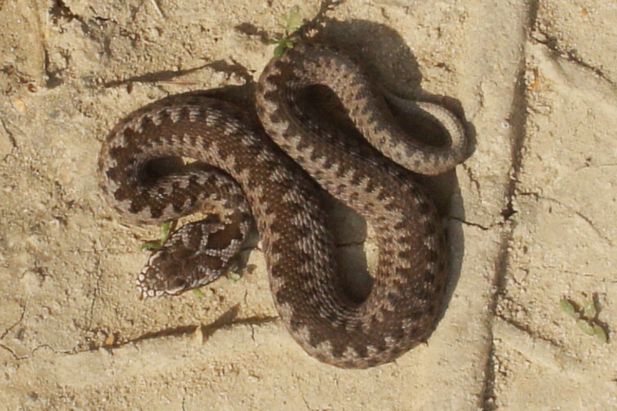 У сеголеток и годовиков гадюки в данной местности встречаются 3 типа окраски: коричневатая, чёрно-серая и красноватая. Чаще наблюдаются варианты с коричневыми тонами и хорошо различимым тёмно-коричневым рисунком на спине – 82% (рис. 1, б). Некоторые особи более светлые (рис. 1, а), такие встречаются значительно реже. Глаза у тех и других – красные, относительно светлые. Нижняя часть хвоста целиком жёлтая, брюхо от анального щитка до горла однотонно-коричневое (без рисунка).