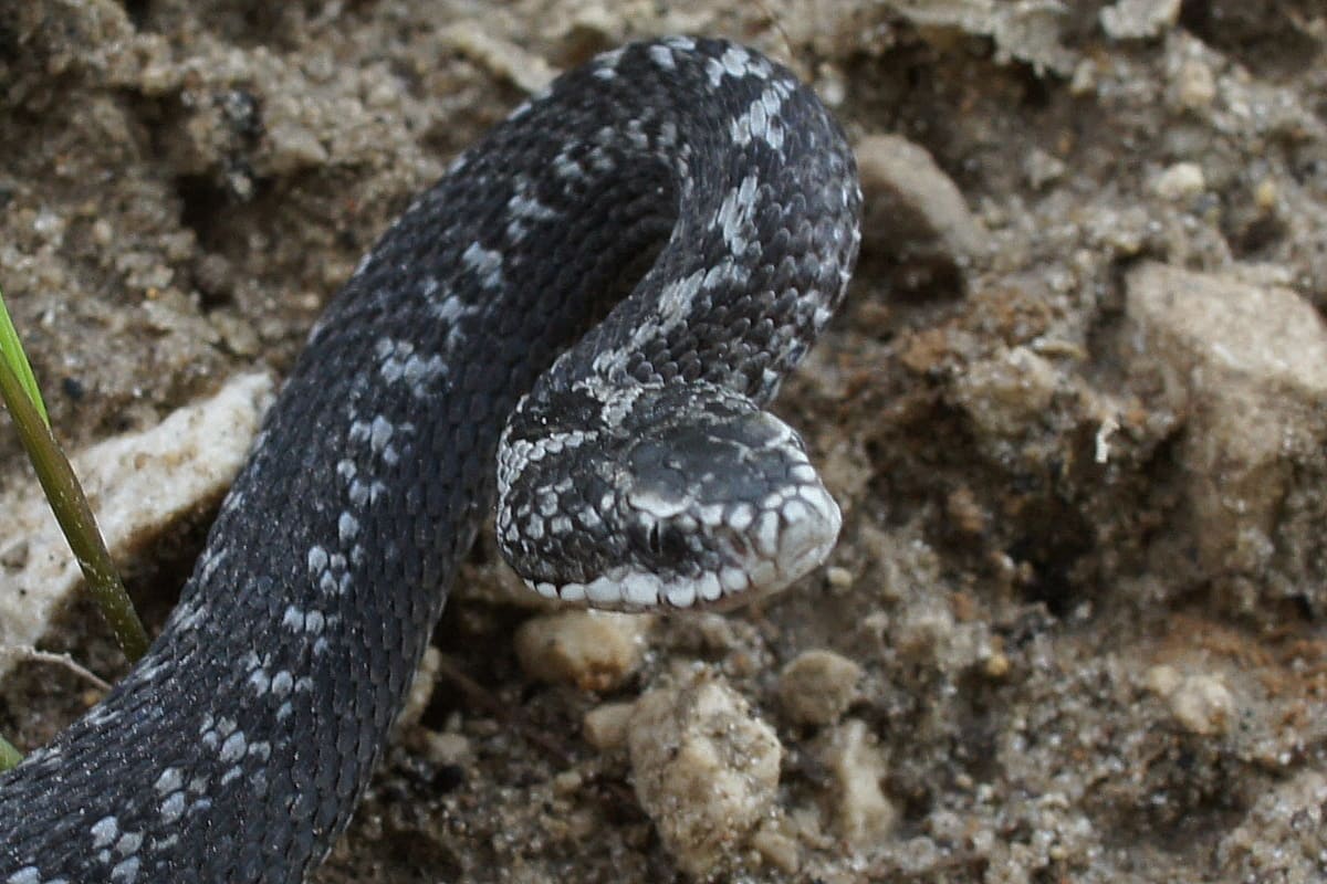 Чёрно-серый тип окраски выявлен только у одной особи (рис. 1, в) – 9%. Она отличается бесцветным белёсым (а не жёлтым) кончиком нижней поверхности хвоста и бесцветными серебристыми глазами (рис. 2, а). Не исключено, что это проявление анеритризма. Аналогично лишь однажды в данной возрастной группе наблюдалась особь более насыщенного оттенка (цвета красного кирпича), её сфотографировать не удалось. Отличительная особенность той особи заключалась в очень светлом золотисто-жёлтом цвете глаз, а так же в присутствии сразу трёх цветов в окрасе спины и головы (белого, насыщенного красно-коричневого и чёрного, причём последний не свойственен в окраске других «цветных» гадюк в данной возрастной группе)
