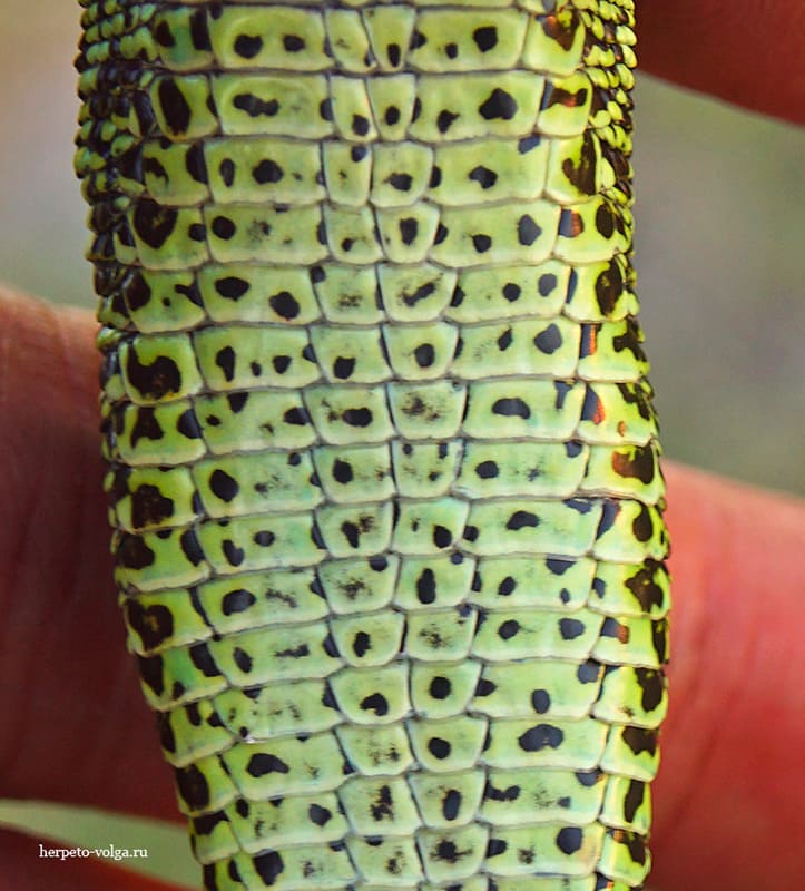 Для тех, у кого глазомер не правильно настроен или снимок сделан так, что фиг определишь размер (таланты бывают разными), советую посмотреть на рисунок тела. У прыткой рисунок включает в себя хорошо выраженную светлую полосу вдоль всего хребта, пятен различной формы и размеров вдоль нее, а также двух светлых полос по бокам. Еще у них имеются светлые "глазки" по бокам, которые иногда могут сливаться в прерывистую линию. Это описание относится как к самцам, так и к самкам. Только у самцов эти полосы и пятна на зеленом фоне, а у самок - на буровато-сером или коричневом. Хотя у них есть отдельные морфы, где вообще окраска тела однотонная без пятен и полос (immaculatа-concolor), но это частности.