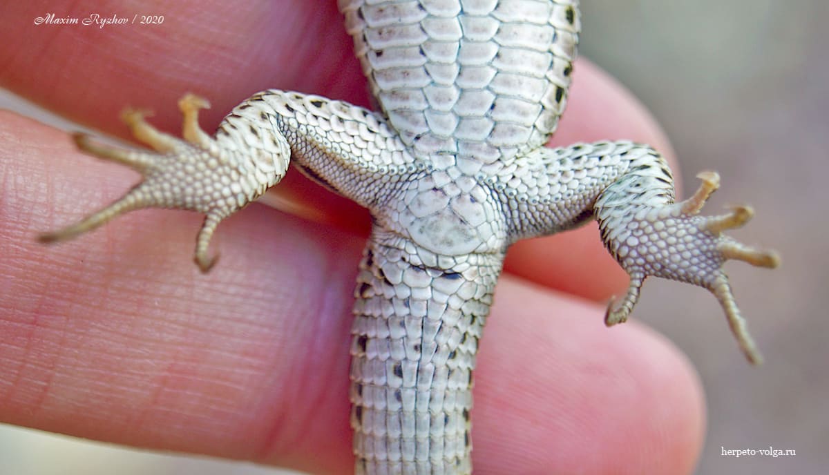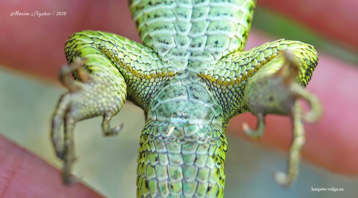 И еще, последний способ, если все вышеописанные вам не подошли и вы до сих пор не поняли кто это - самец или самка? Переворачиваем ящерицу на спину и смотрим анальный щиток, который находится между задними ногами. У самцов, он чуть ли не в два раза крупнее, так как скрывает половые органы и по ширине, практически, равен ширине хвоста (у разных особей по разному, поэтому не буду ударяться в статистику). У самки, естественно, значительно меньше. Этот признак хорошо работает даже у не половозрелых особей (сеголеток в расчет не берем). Кроме того, у самцов более выражены бедренные поры и хвост у основания имеет утолщение из-за того, что там спрятаны копулятивные органы.