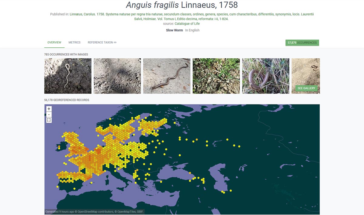 Посмотрим на данные по Anguis fragilis. Почти 58 тыс записей со всей Европы и России. Можно, конечно, свалить, что сюда записывались все встречи веретеницы без разделения на подвиды... Но там и по подвидам есть, если полазить. А ведь 8 лет прошло с момента публикации. И наука в Европе развивается гораздо быстрее нашей (как не прискорбно это признавать).