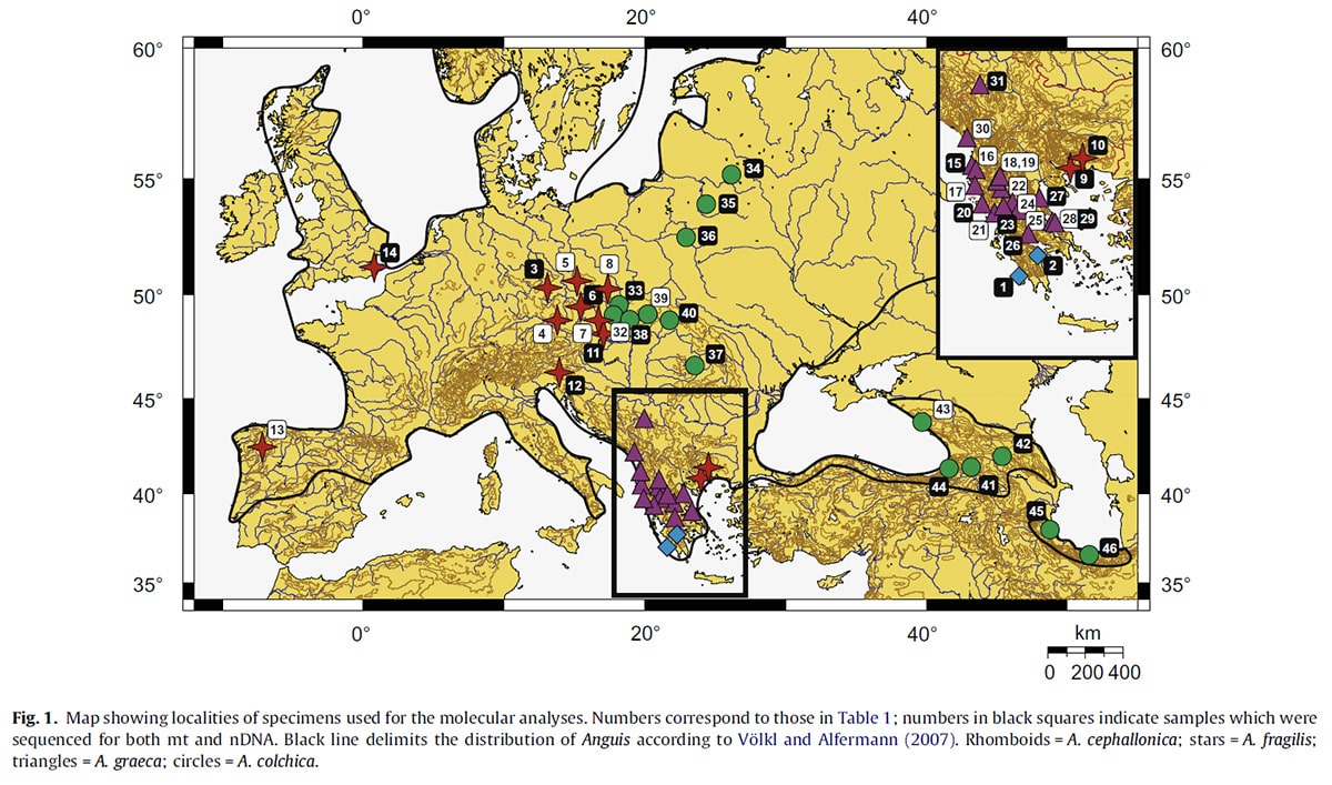 Во-первых - это работа по распространению Anguis colchica и Anguis fragilis в Европе (Daniel Jablonski et al., 2017), в которой приводится новая точка из России. Правда из Калининградской области, и под именем "Anguis fragilis". Кроме того, для написания которой были использованы животные раздавленные на дорогах Европы. Опять же непонятно, что мешало им собрать трупики веретениц в каком-нибудь Подмосковье или под Питером? Да хотя бы в Финляндии и то было бы к нашим ближе. И снова повторяется точка из Краснодарского края.