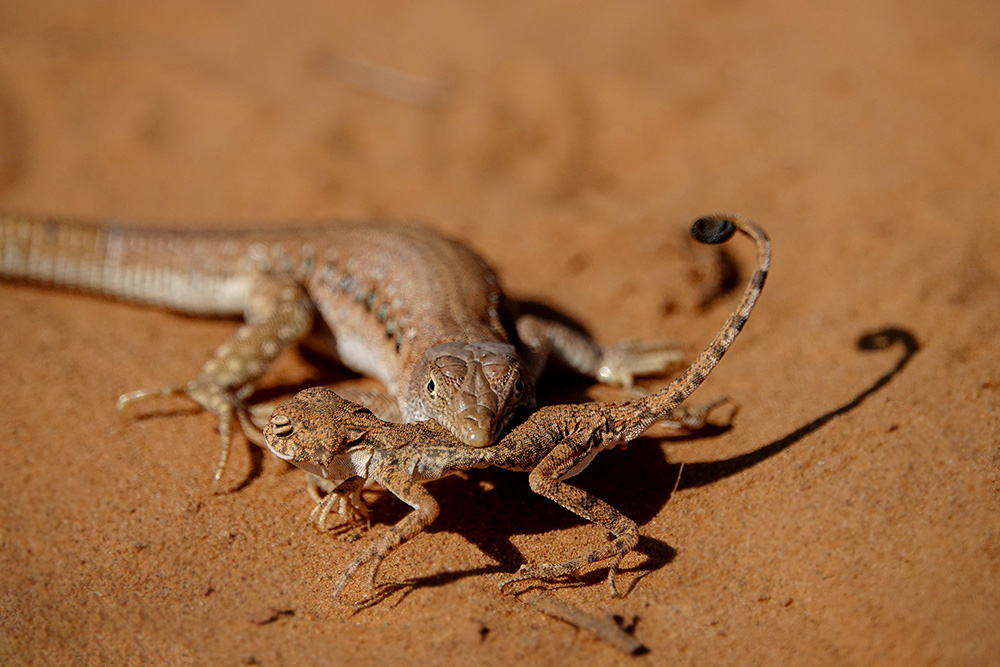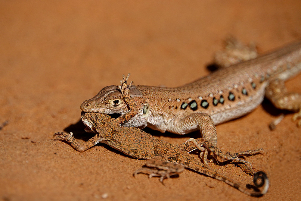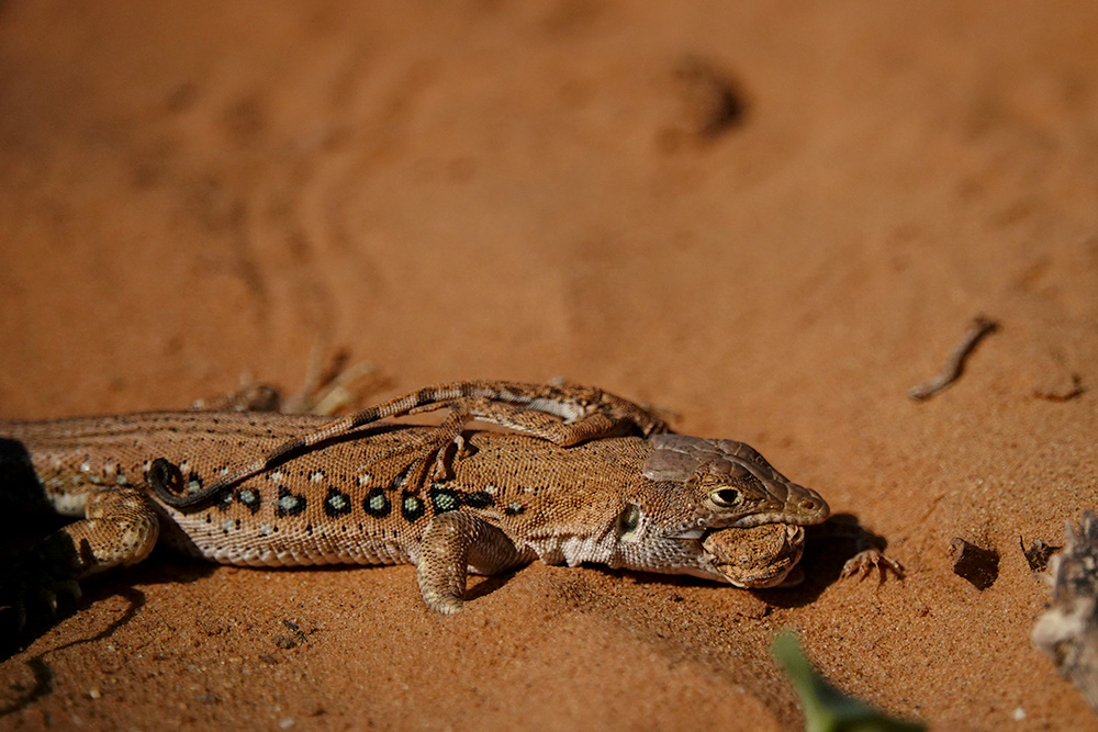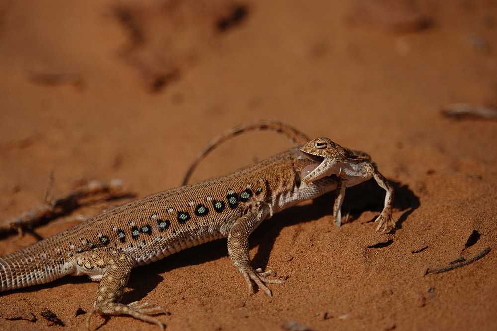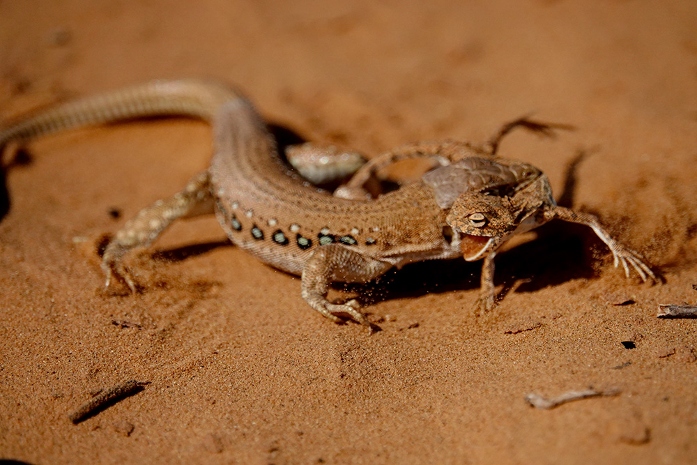 Светлана Иваненко сфотографировала процесс охоты быстрой ящурки (Eremias velox) на круглоголовку-вертихвостку (Phrynocephalus guttatus). Все это действие происходило 21.8.2018, в окрестностях с. Бергин (Республика Калмыкия, Россия). Понятное дело, что тут не полноценная заурофагия (специализация питания ящерицами), а скорее всего единичный случай. Но тем не менее...