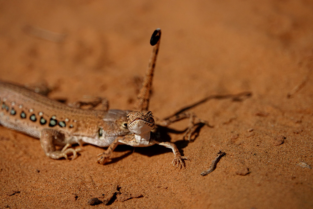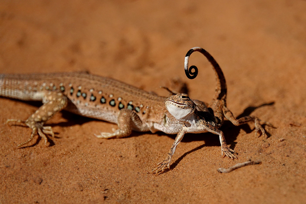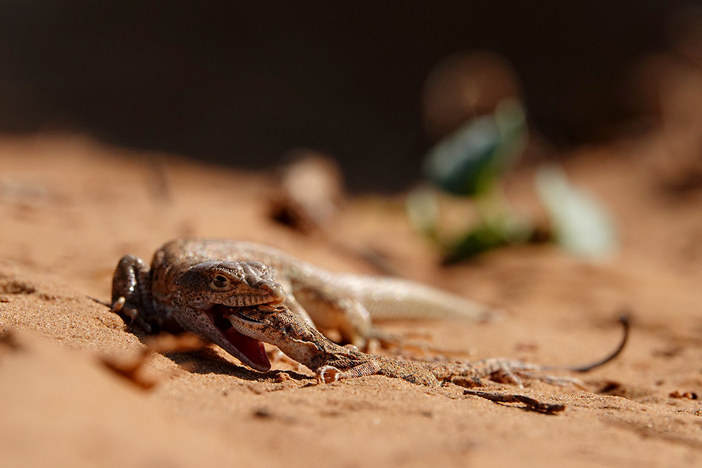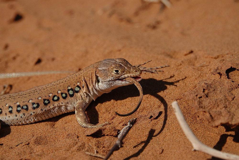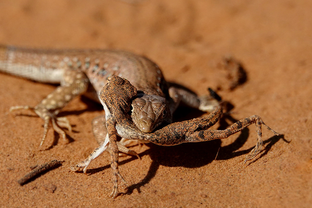 Светлана Иваненко сфотографировала процесс охоты быстрой ящурки (Eremias velox) на круглоголовку-вертихвостку (Phrynocephalus guttatus). Все это действие происходило 21.8.2018, в окрестностях с. Бергин (Республика Калмыкия, Россия). Понятное дело, что тут не полноценная заурофагия (специализация питания ящерицами), а скорее всего единичный случай. Но тем не менее...