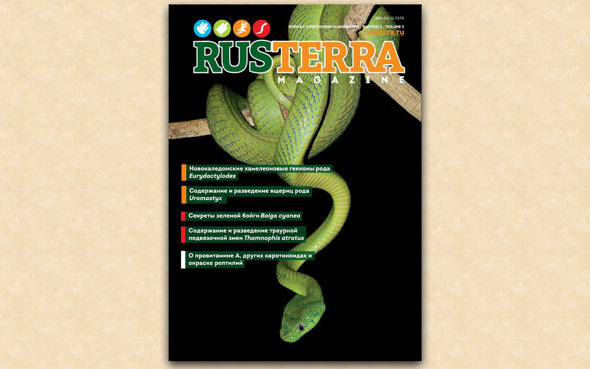 Вышел третий номер журнала о рептилиях и амфибиях «RusTerra Magazine». Мы рады встречи со старыми друзьями и ждем новых. Журнал по прежнему открыт для всех любителей террариумистики и профессиональных герпетологов. В третьем номере мы открыли рубрику – «встреча с интересными людьми». Мы познакомим вас с интересными и преданными террариумистике и герпетологии людьми. По-прежнему рады новым интересным идеям, новым проектам и, конечно же, новым авторам, готовым поделиться своим опытом на страницах нашего журнала. Приглашаем партнера для издания журнала на английском языке.