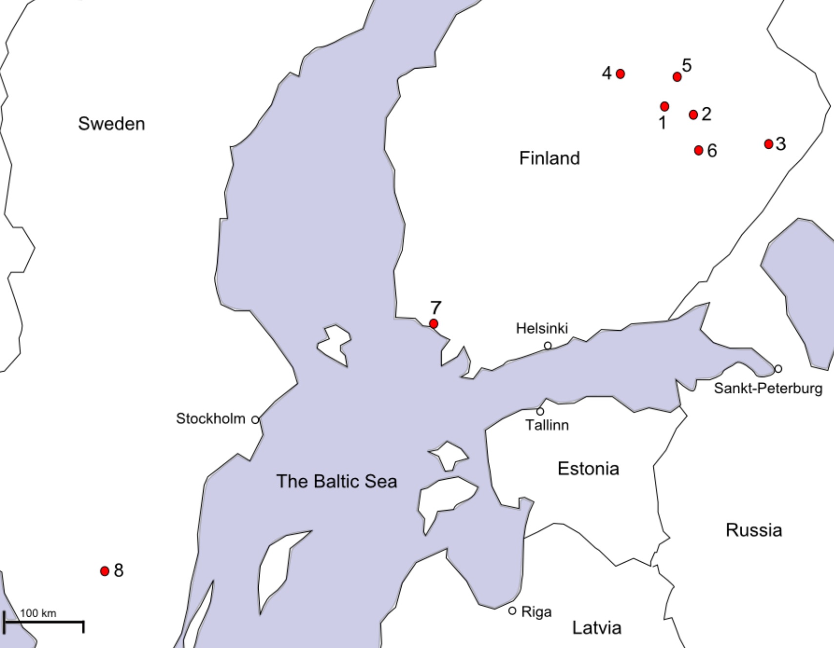 Карта находок миниатюрных гробиков в церквях: 1 — Куопио, 2 — Туусниеми, 3 — Кийхтелюсваара, 4 — Пиелавеси, 5 — Нильсия, 6 — Хейнявеси, 7 — Турку, 8 — Брингетофта. Рисунок из статьи S. Hukantaival, 2015. Frogs in Miniature Coffins from Churches in Finland — Folk Magic in Christian Holy Places