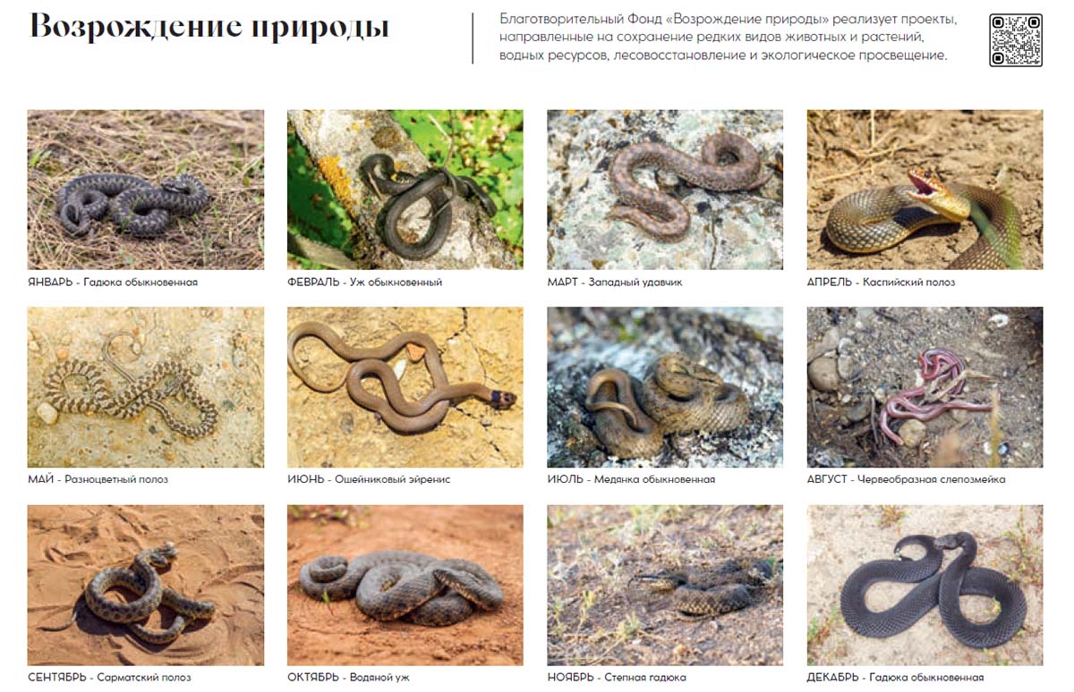 В качестве подарка, дарим вам календарь со змеями. Каждый месяц посвящен какому-то виду змеи, встречающейся на территории Поволжья или Дагестана, с фотографией и небольшим описанием. Кроме того, мы позаботились о том, чтобы каждый мог выбрать календарь на своем родном языке.