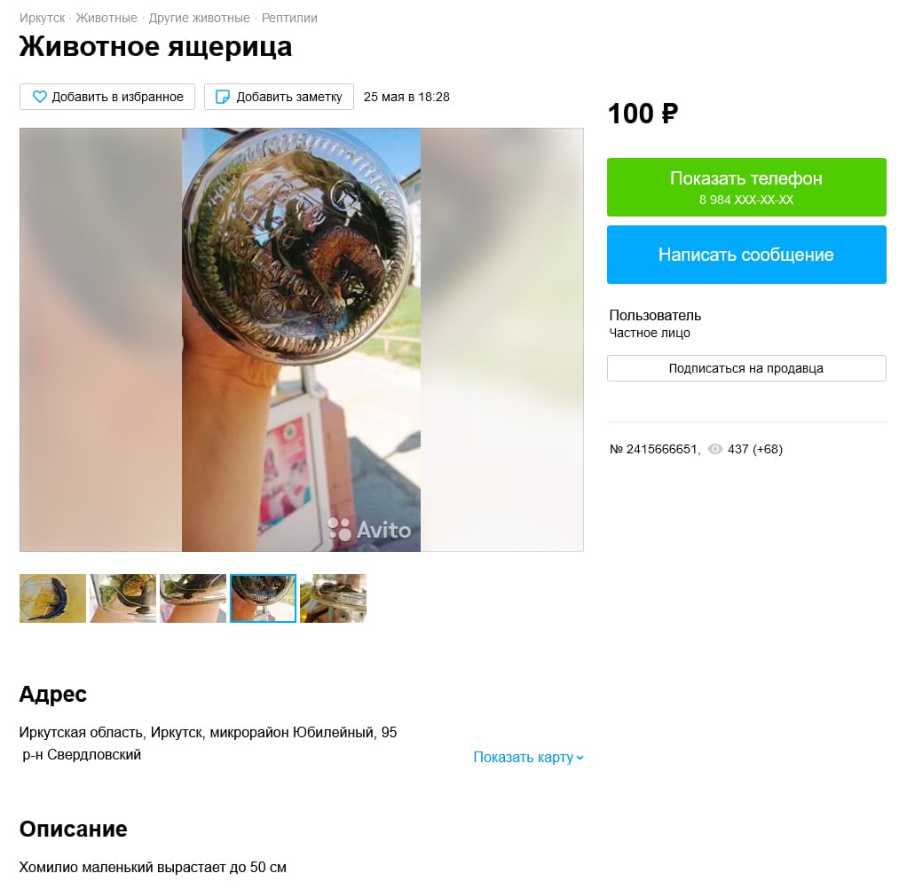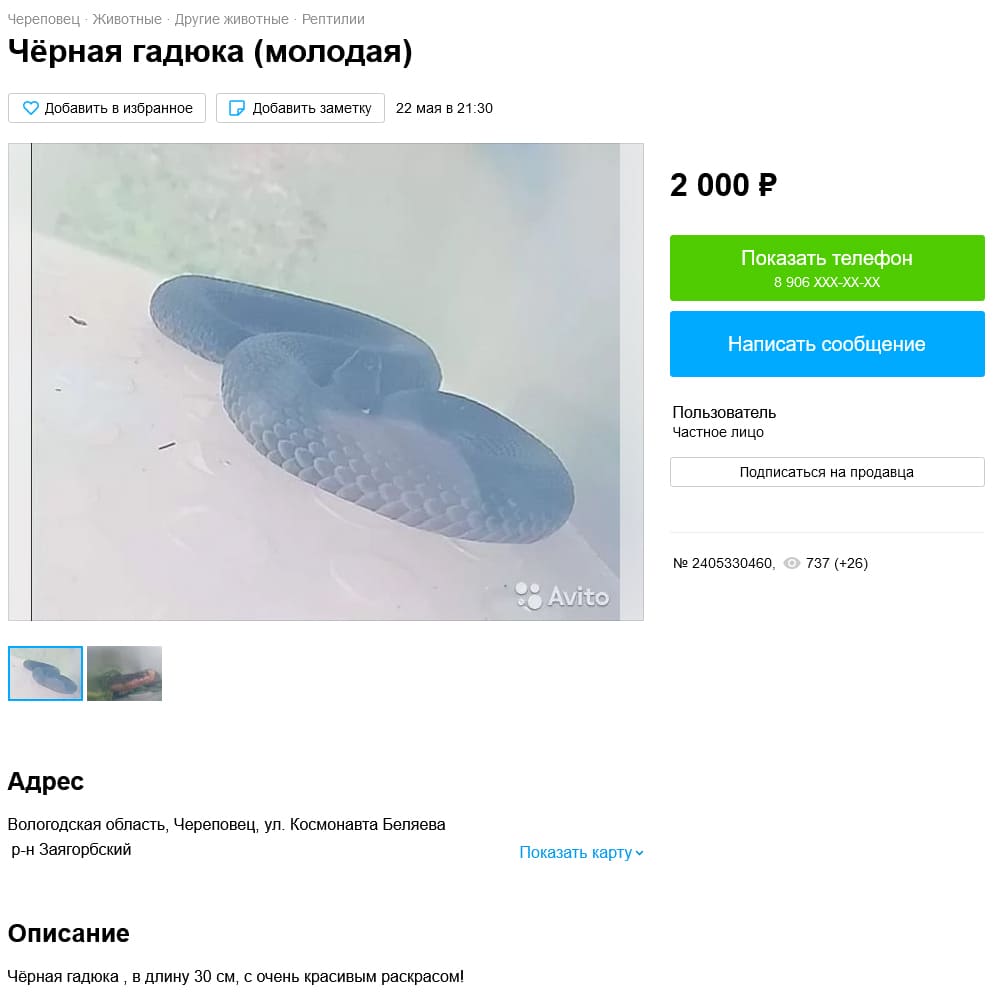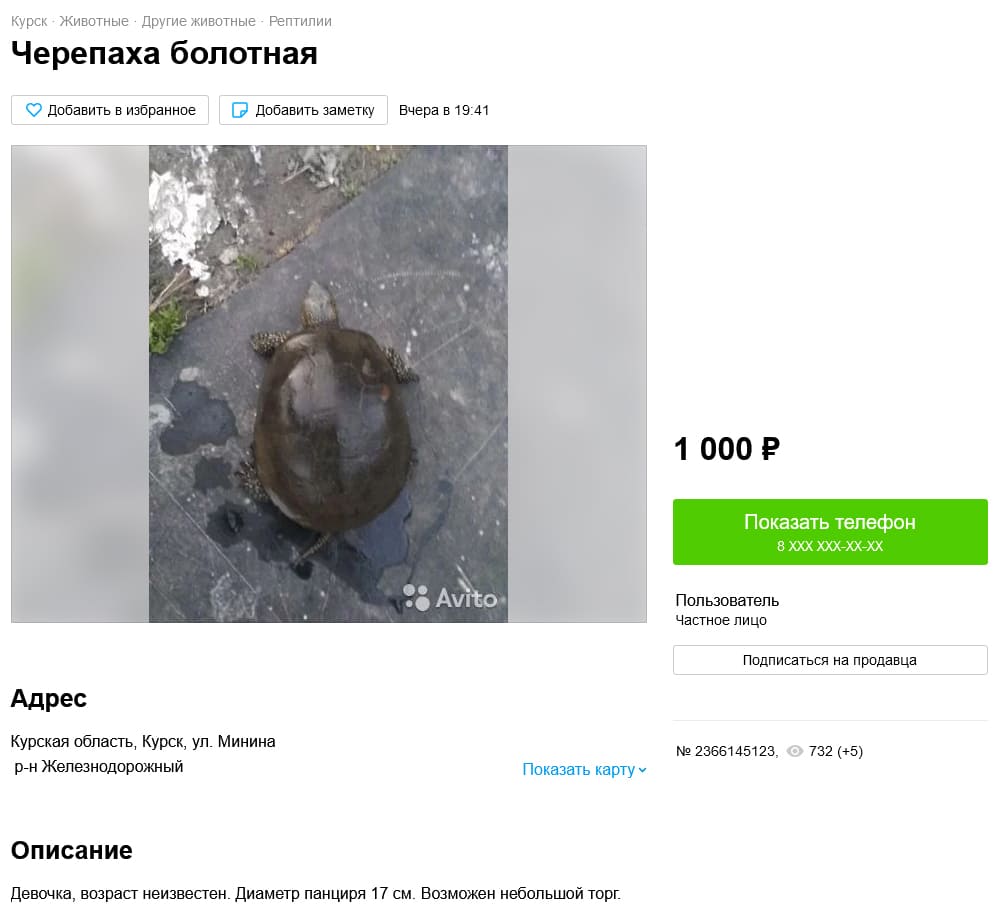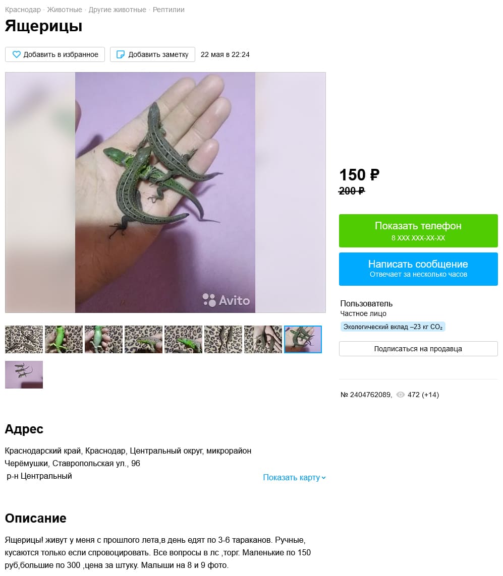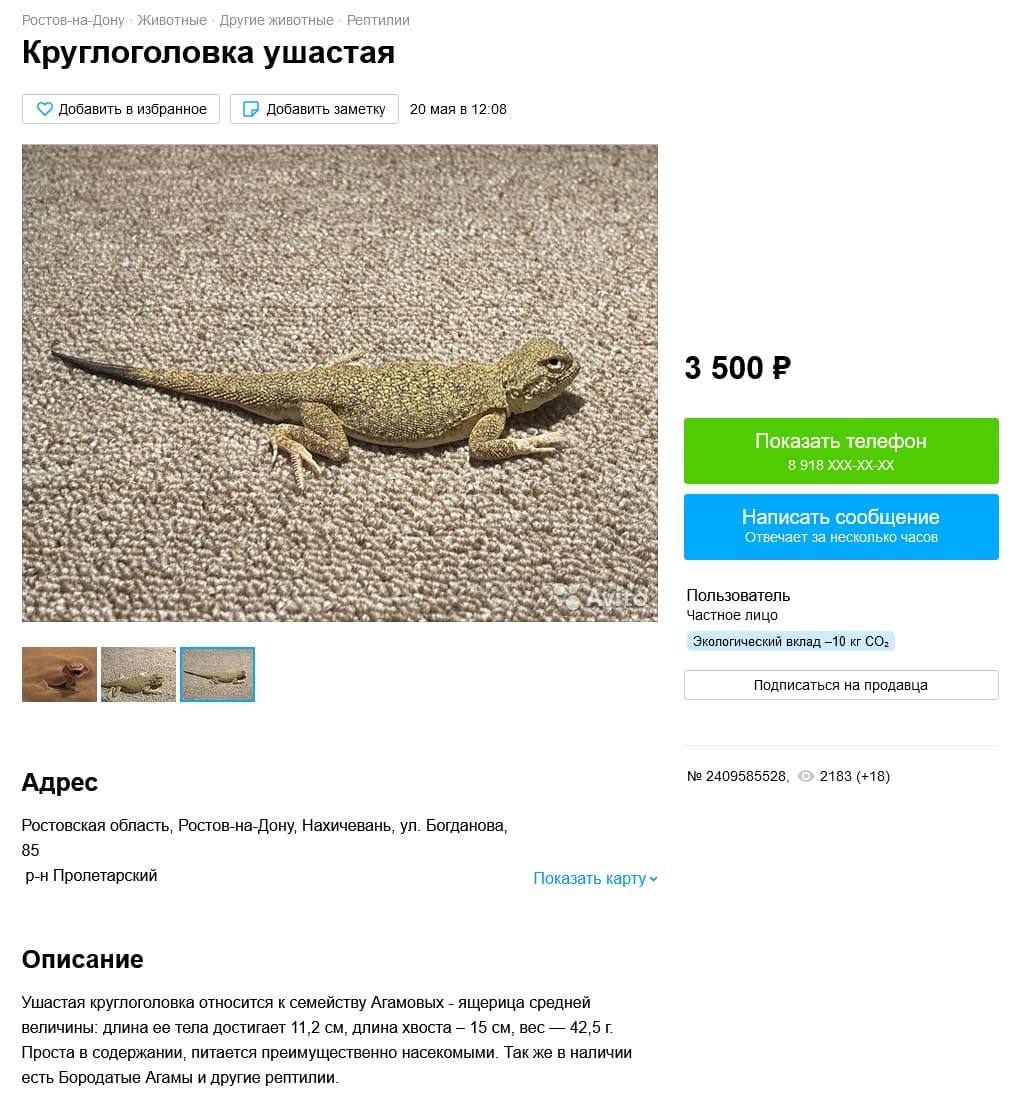 Также удалось найти одно объявление с продажей ушастой круглоголовкой. Откуда превезена особь неизвестно, так как не указано, учитывая, что в Ростовской области она не встречается. Но, при этом идет сильное сокращение популяции, которое связывают как с выловом (КК РФ, 2021), так и с климатическими причинами (Мишустин, 2022). Именно по этой причине занесена в Красную книгу РФ (2021) (категория 2 – сокращающиеся в численности вид).