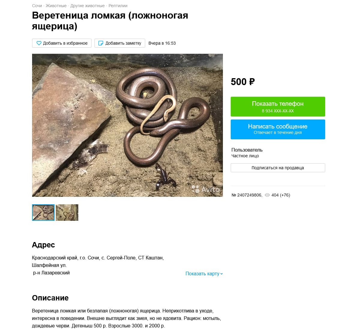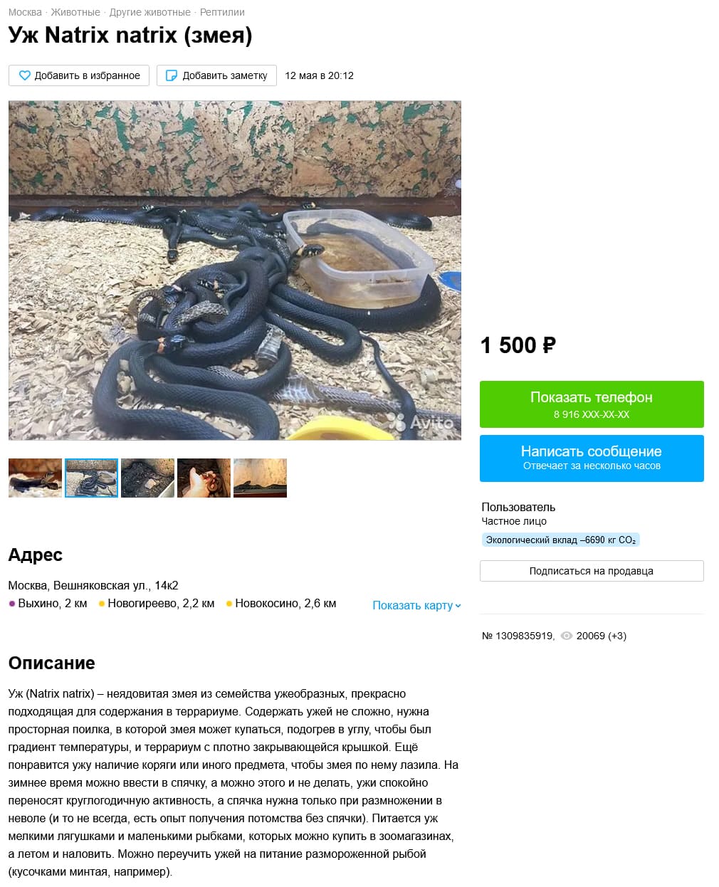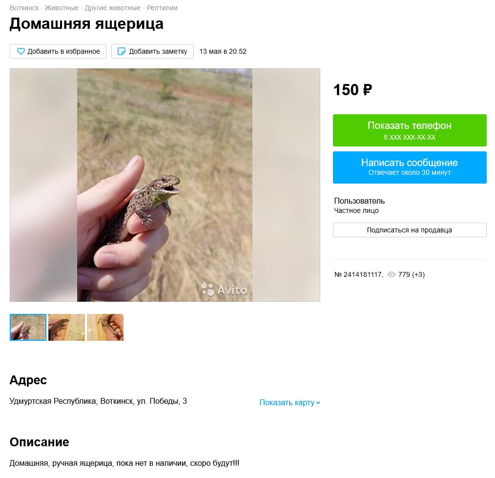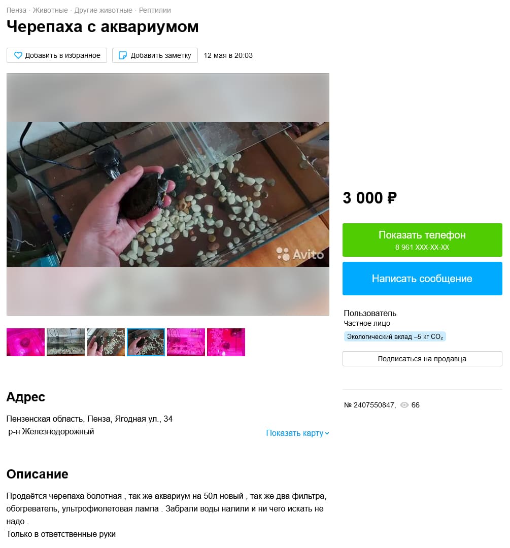 Также удалось найти одно объявление с продажей ушастой круглоголовкой. Откуда превезена особь неизвестно, так как не указано, учитывая, что в Ростовской области она не встречается. Но, при этом идет сильное сокращение популяции, которое связывают как с выловом (КК РФ, 2021), так и с климатическими причинами (Мишустин, 2022). Именно по этой причине занесена в Красную книгу РФ (2021) (категория 2 – сокращающиеся в численности вид).