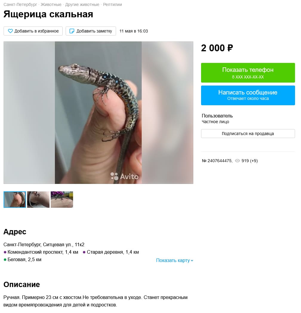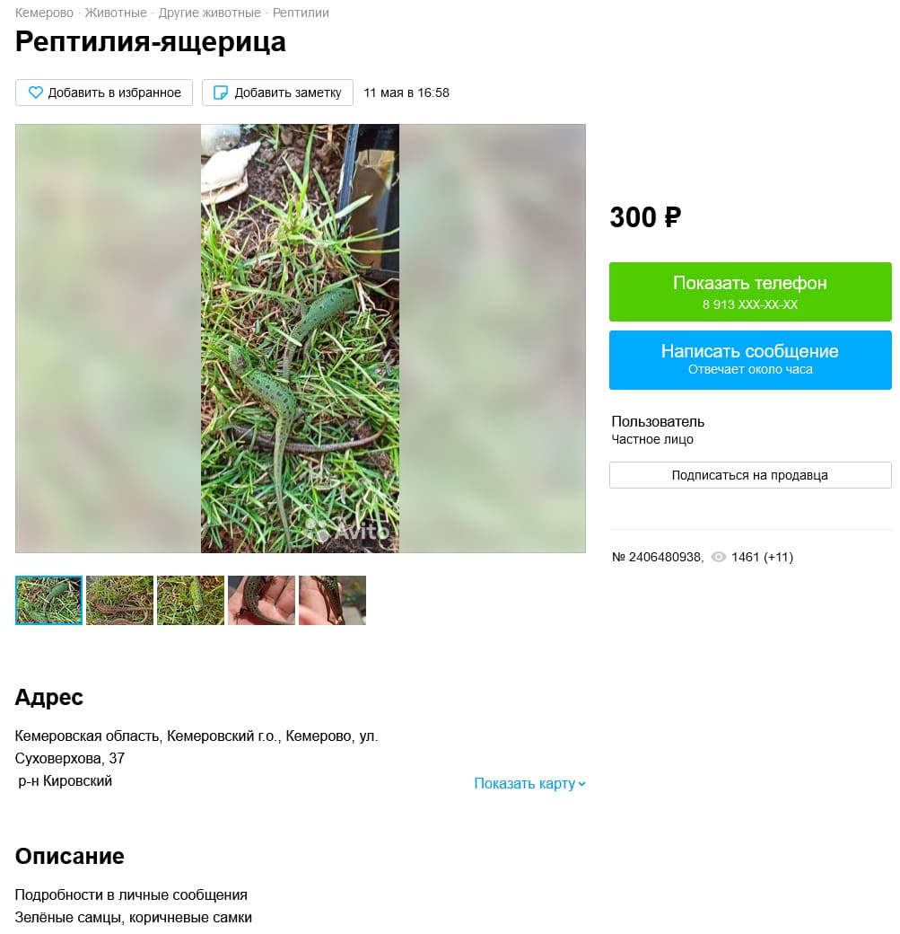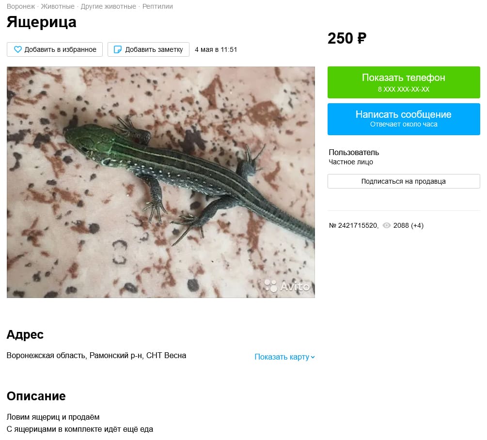 Если вы думаете, что ассортимент ограничивается только широко распространенными видами ящериц, то заблуждаетесь. В дебрях avito можно найти продажу скальной ящерицы (кто-то из Darevskia sp.) и зеленой ящерицы (Lacerta viridis). Такую цену, можно объяснить транспортировкой, так как зеленая ящерица, на территории современной России не встречается (распространёна в Молдавии и Украине).
