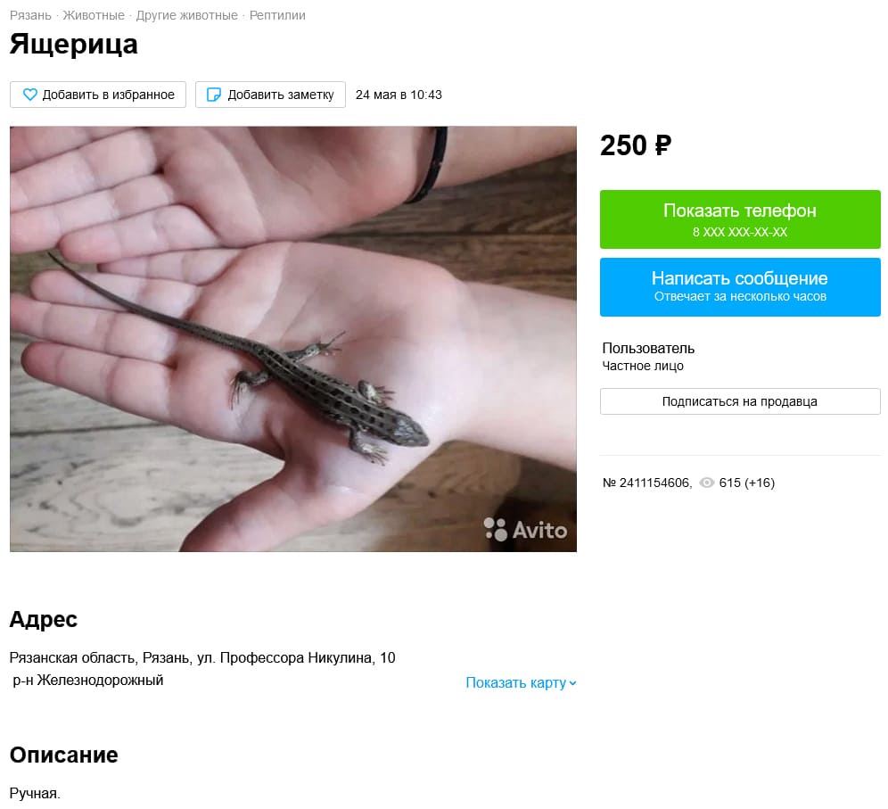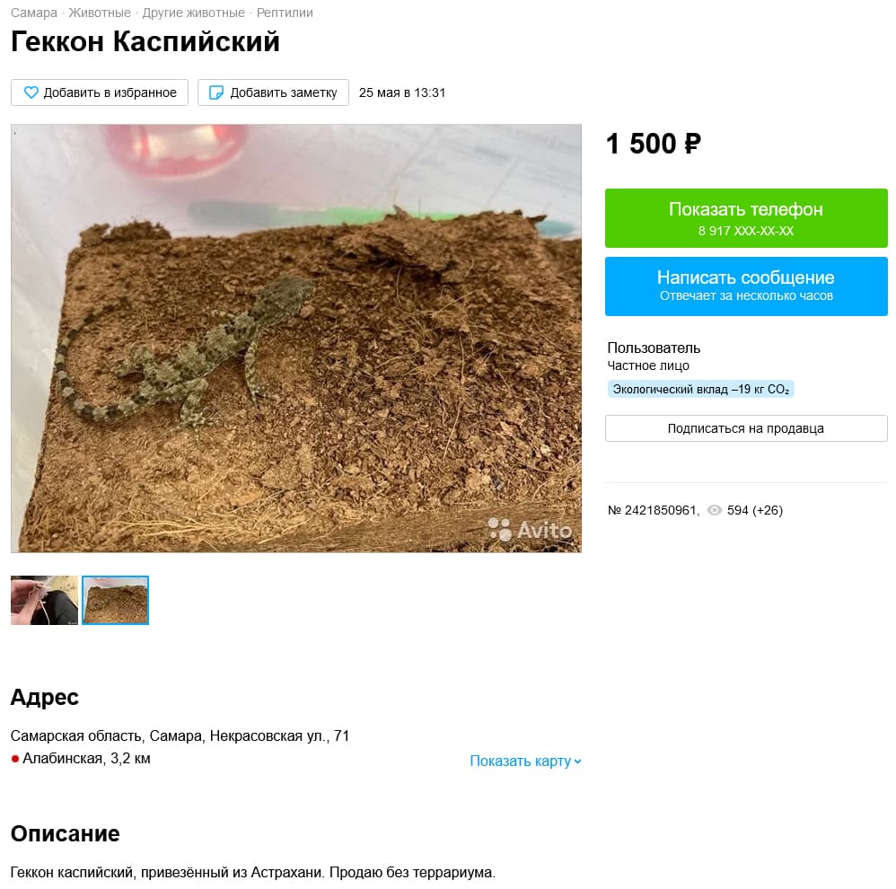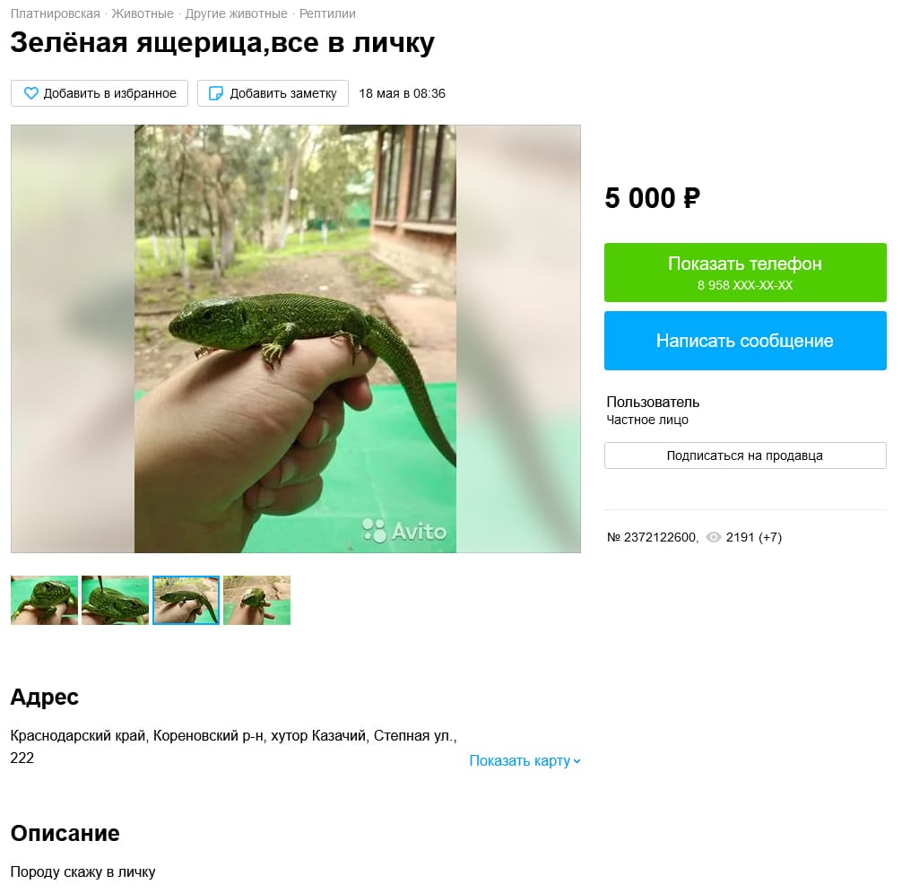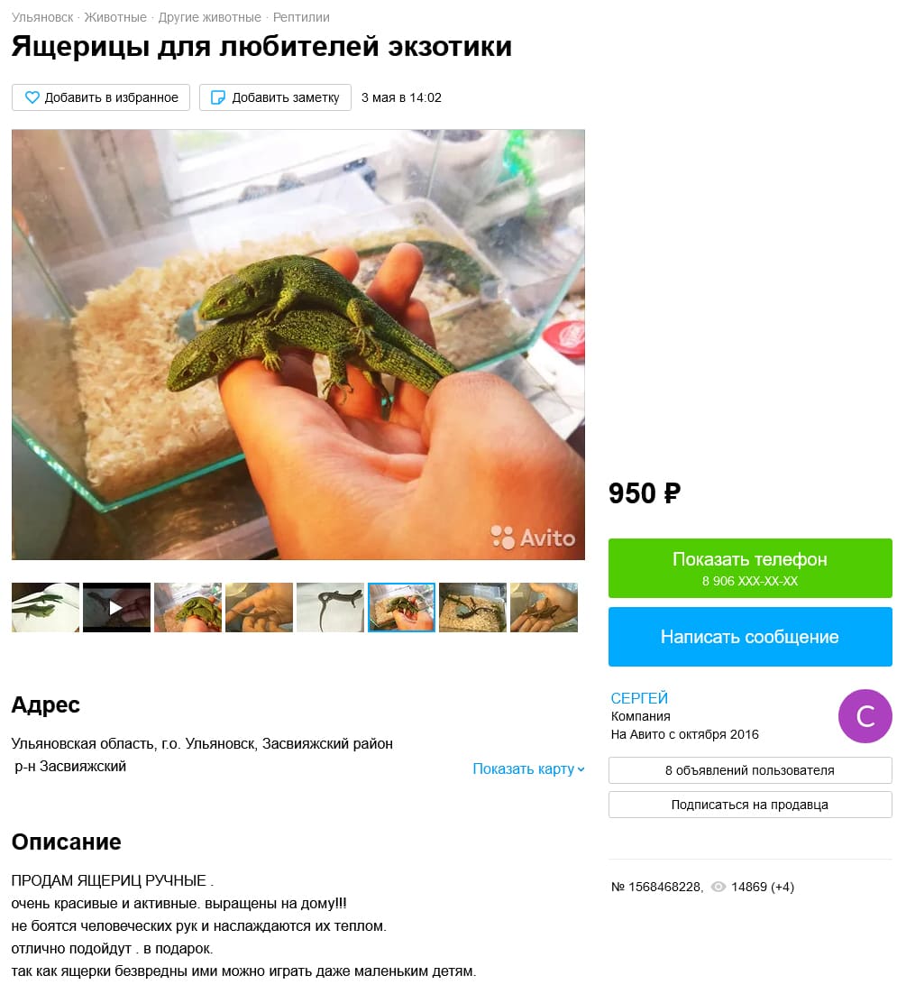 Продолжаем обзор торговой площадки под названием Avito. Вчера мы смотрели как там продаются земноводные. А сегодня поговорим про продажу рептилии. Забегая вперед, должен сказать, что ситуация еще хуже чем с амфибиями. В некоторых объявлениях черным по белому указано, что вылов с природы, но модераторам Avito на это пофигу. Кстати, тут есть один интересный момент, но об этом будет в конце поста.