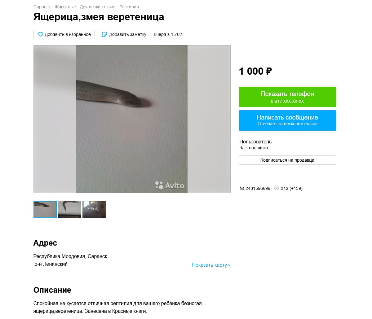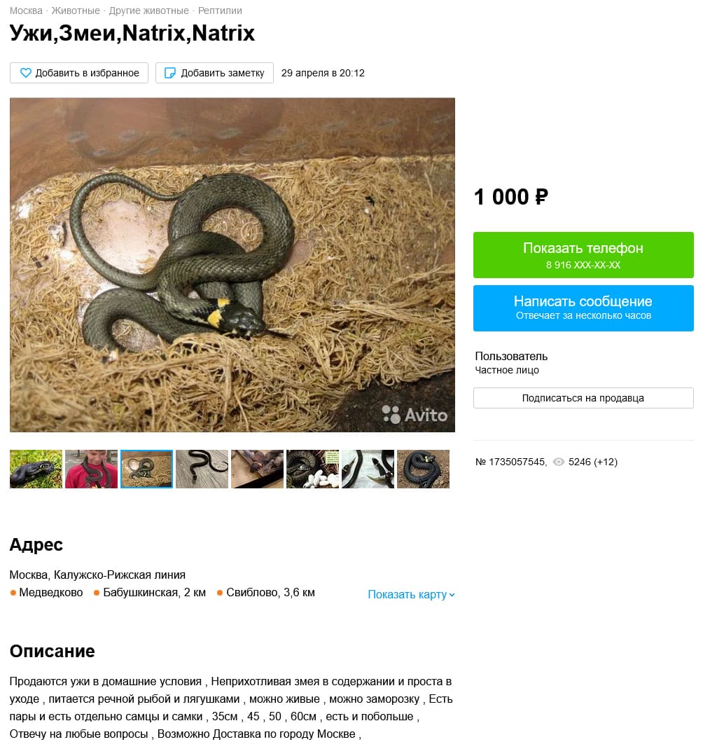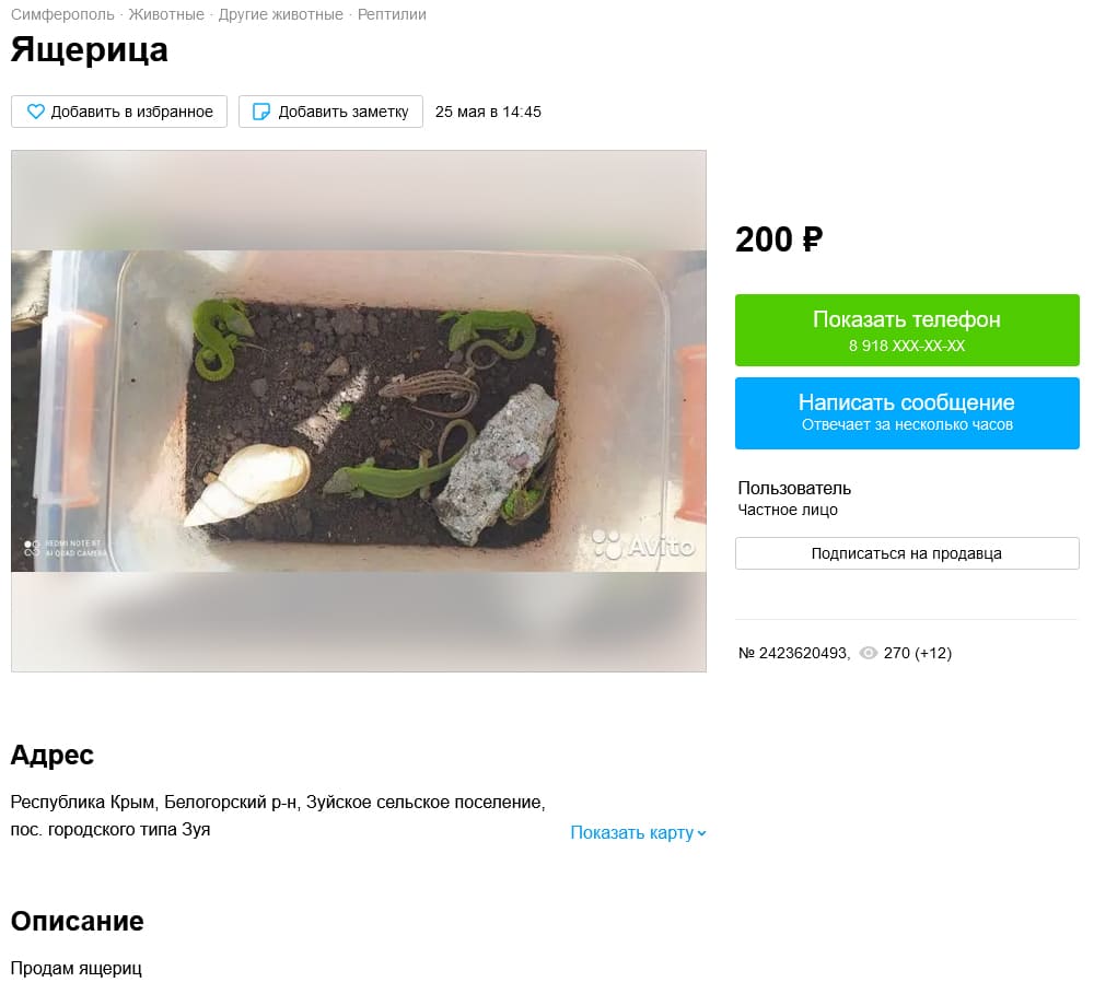 Кроме того, ест еще один момент. По словам людей, которые там продают домашних и разводных рептилий (маисовый полоз, например и т.д.), avito блокирует виды которые занесены в список СИТЕС, МСОП и в подобные издания. Но, при этом практически игнорит Красную книгу РФ. Какая-то непонятная ситуация. Это при том, что у нас имеется статья в УК (ст. 258.1) за незаконное приобретение, перевозку, пересылку и продажу видов включенных в Красную книгу РФ. Понятное дело, что речь идет о федеральной КК, а не о региональных, к сожалению. Но, хотя туда вполне попадает продажа ушастой круглоголовки.