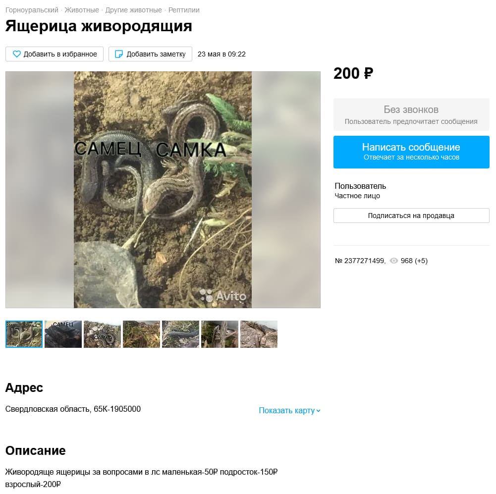 Живородящих ящериц также не обошли вниманием, но судя по количеству объявлений, они не особо пользуются спросом. Что, скорее всего, связано с влажными местообитаниями, так как ловить прыткую на лугу гораздо легче, чем лазить по берегам различных водоемов.