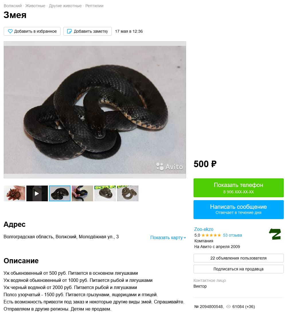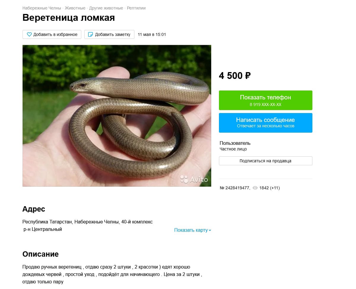Из змей продают как ужей, так и гадюк. Не удалось найти полозов на продажу (палласова и каспийского), я также ящеричную змею. Видимо агрессивность тоже сказывается, не каждый отважится его схватить. А возможно, то что нужно ехать довольно далеко и не факт, что получится поймать. Ну и дома этих довольно не маленьких змей, тоже держать такое себе удовольствие, для тех кто в них не шарит. Узорчатых полозов не рассматривал, так как их довольно часто держат дома и там не понятно - природник он или разводной.