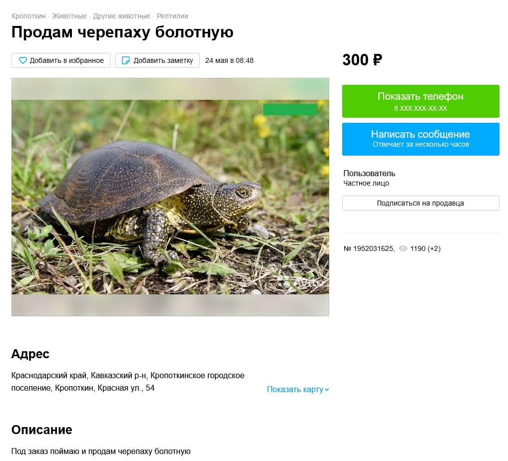 По традиции прошлого поста, начнем в систематическом порядке. Удивительно, но предложений с продажей болотных черепах, не так много. Я думал, что их будет гораздо больше. Это определенно радует. Не радует, что один из этих мудланов не удосужился даже сфоткать черепаху, а тупо стырил мою фотографию, да еще и логотип замазал. Читаем описание "... Под заказ поймаю и продам". Т.е. это насколько нужно охренеть, чтобы в открытую писать - "Я мудак, я барыжу животными из природы". Это при том, что данный вид находится в красном списке МСОП (угроза исчезновения). А в Краснодарском крае она занесена в региональную (2007) и федеральную КК (2021). правда черноморская популяция, но не суть.