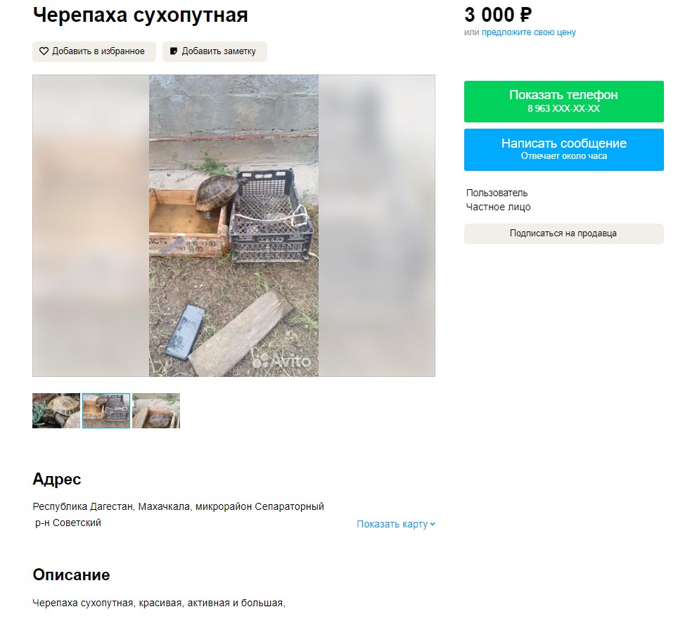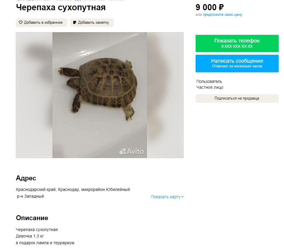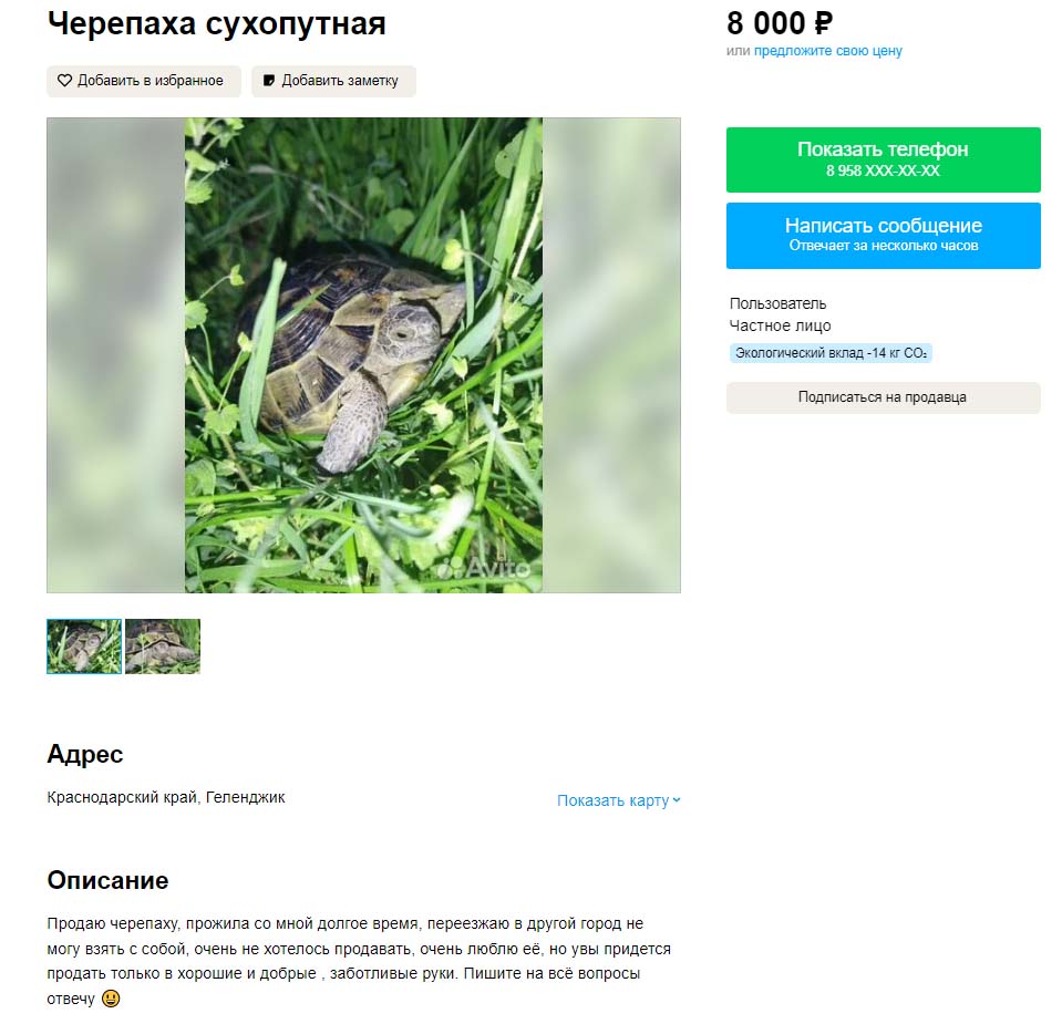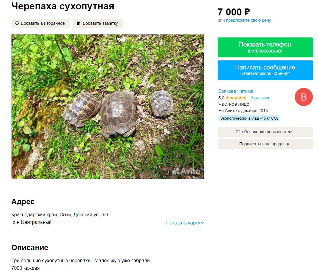 Теперь давайте посмотрим объявления на Avito. Ставим регион Краснодарский край (по причине того, что там обитает черепаха Никольского (T. graeca nikolskii)), в поиск вбиваем "черепаха" и самое первое предложение где некая Фатима барыжит краснокнижным видом. Статья прямо без проблем светит, даже доказывать ничего не надо. Все на фотографии видно.