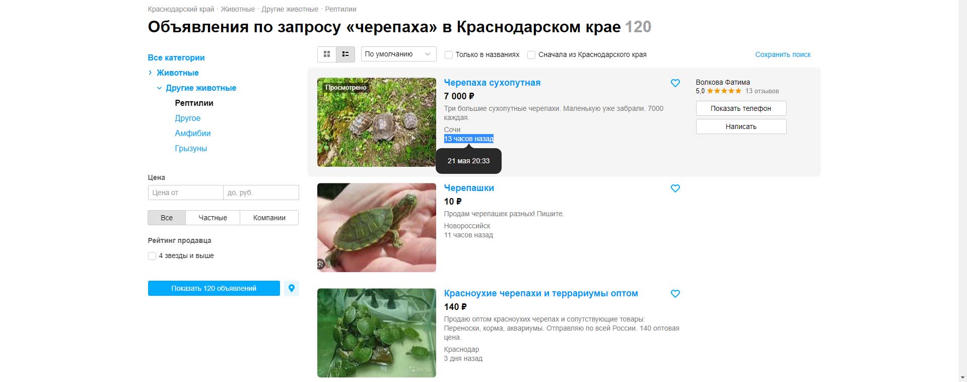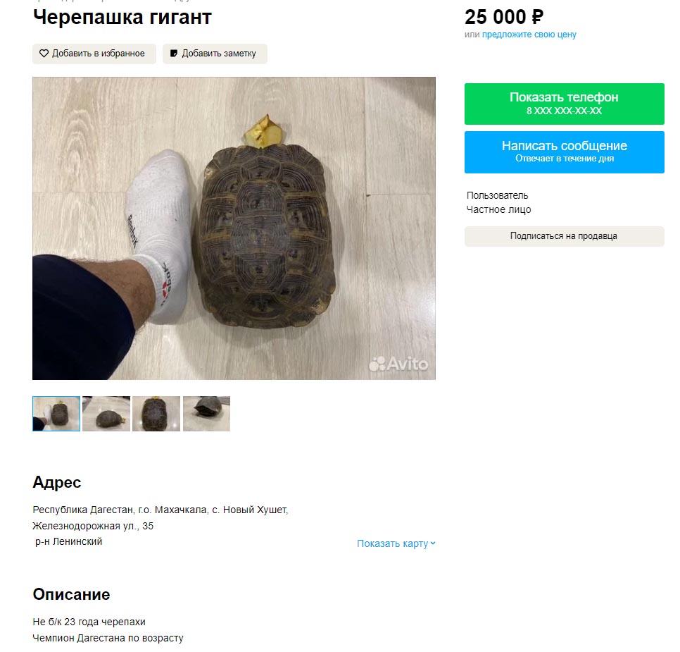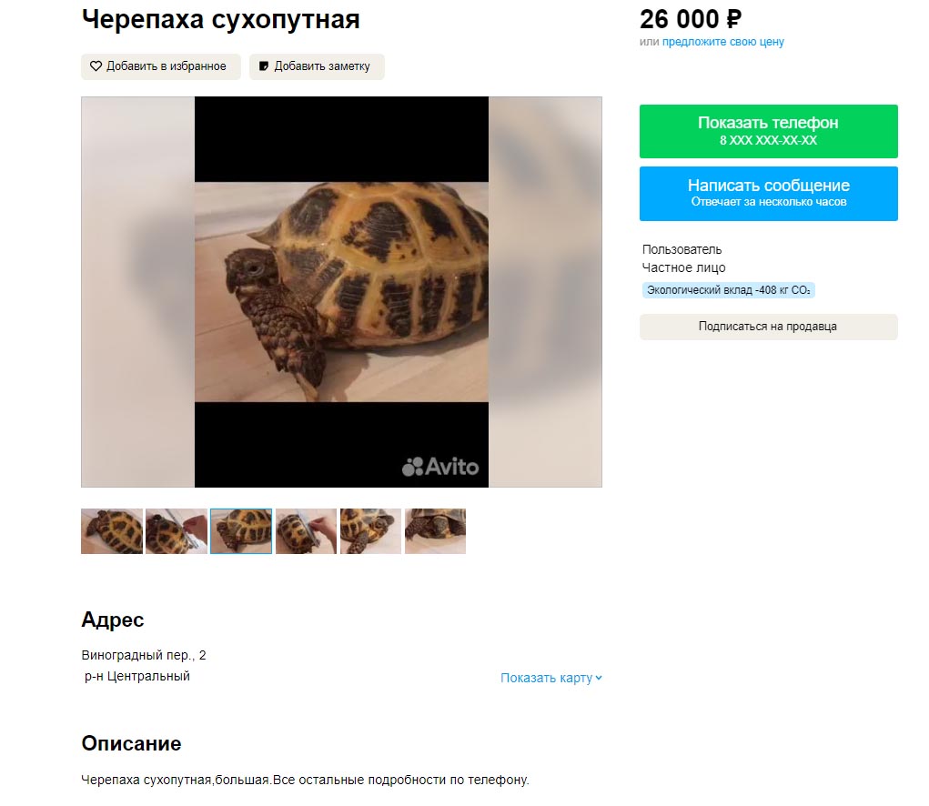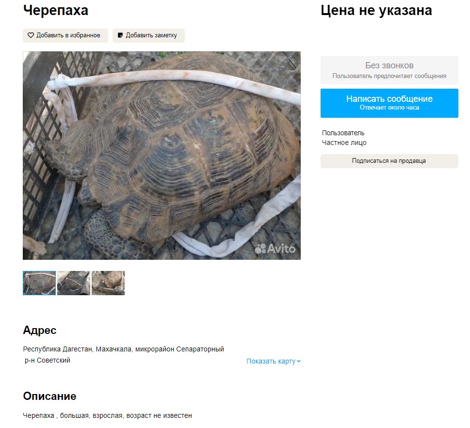 Теперь давайте посмотрим объявления на Avito. Ставим регион Краснодарский край (по причине того, что там обитает черепаха Никольского (T. graeca nikolskii)), в поиск вбиваем "черепаха" и самое первое предложение где некая Фатима барыжит краснокнижным видом. Статья прямо без проблем светит, даже доказывать ничего не надо. Все на фотографии видно.