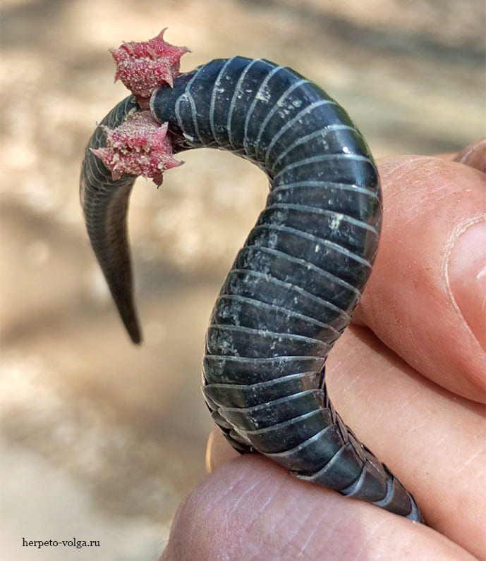 Теперь давайте посмотрим на гадюку с другой стороны, так сказать - в подхвостие. Если весной поймать самца гадюки, он вам без проблем может показать свои причиндалы, его даже об этом просить не надо будет. Это половые органы, которые по научному называются - гемипенисы (от лат. hemi - полу, penis - пенис). В данном случае они вывернуты наизнанку, как носок, когда его снимаешь. Но, это вполне нормально, именно так они работают. Гемипенисы, не только у гадюк, часто имеют различные шипы, наросты и какие-нибудь выступы, которые соответствуют анатомии клоаки самок змей того же вида, образуя своего рода механизм «замок и ключ», который изолирует виды и препятствует спариванию среди неродственных особей. По этой причине внешний вид гемипенисов часто использовался в таксономии змей. Тем более, что у многих видов змей, отсутствует половой диморфизм и все отличие между самцом и самкой заключается в толщине основания хвоста.
