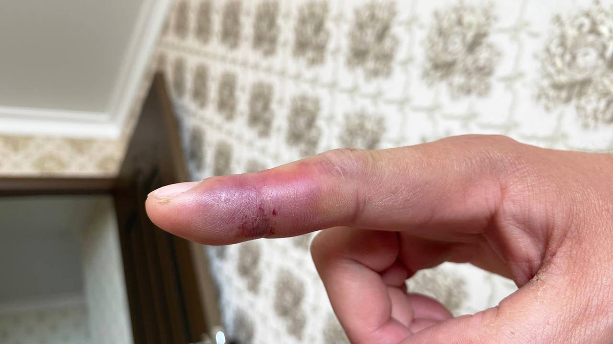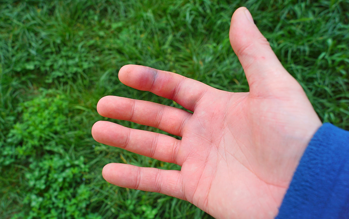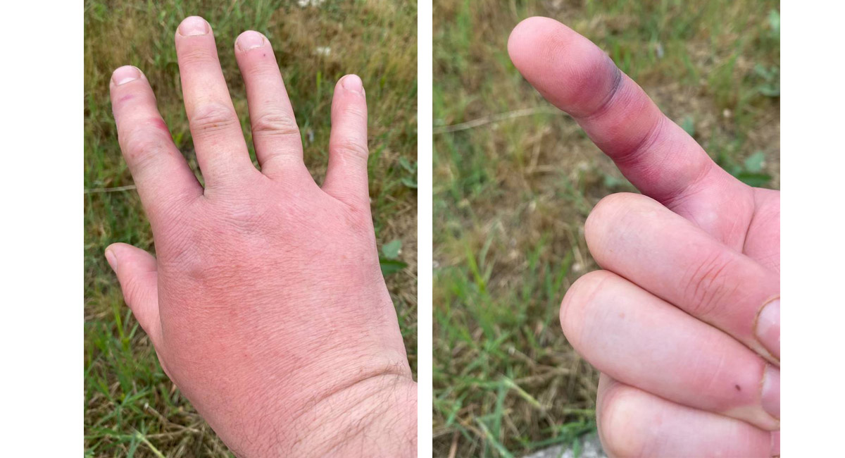 4 мая. Указательный палец через час после укуса. Видно покраснение, отек и место укуса на сгибе между первой и второй фалангой.