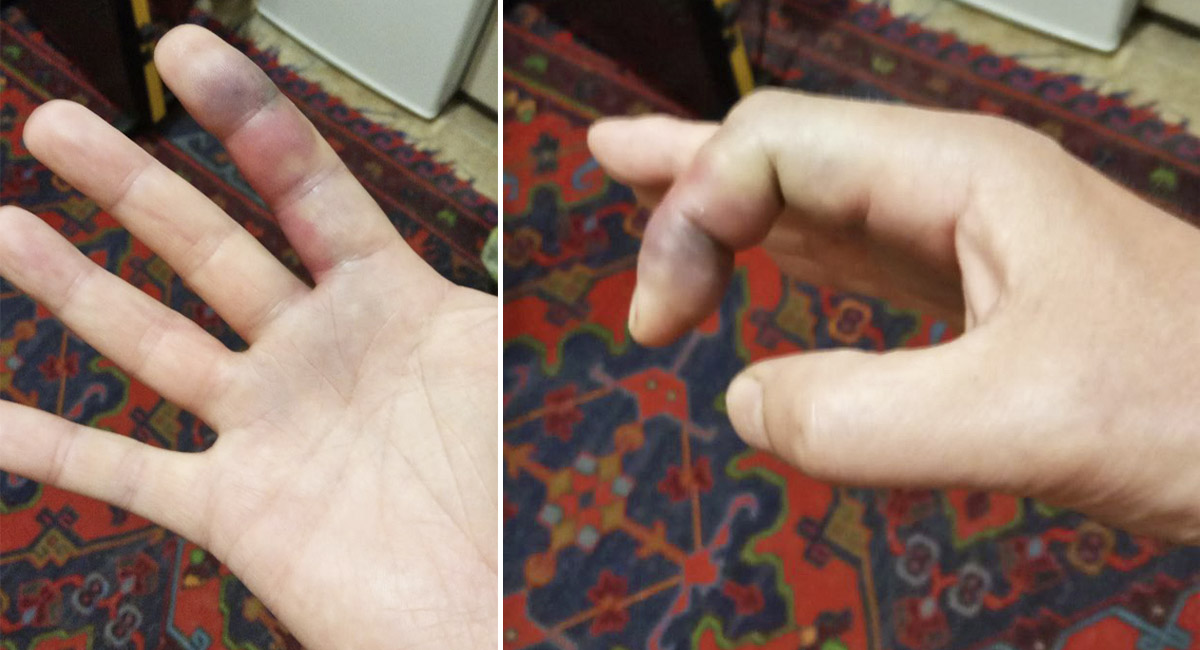 Палец на второй день (5 мая). Кровоизлияния уже практически по всему пальцу и синюшность на тыльной стороне ладони, также невозможность сгиба из-за оттека.