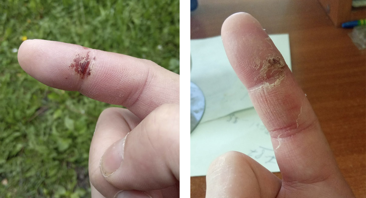 Палец 12 мая (спустя 8 дней после укуса) - опухоль и краснота полностью прошла и 18 мая (спустя 2 недели) - опухоль полностью прошла и стал отслаиваться верхний слой эпидермиса.